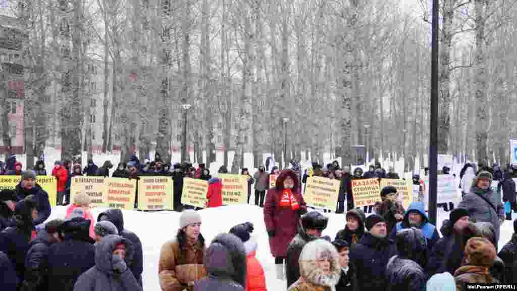 Митинг реготделения КПРФ и Союза профсоюзов СОЦПРОФ сегодня объединил вокруг себя сразу несколько групп протестующих — клиентов Татфондбанка и Интехбанка, дольщиков ЖК "Молодежный" и ЖК МЧС, жителей Осиново, чьи дома определили под снос, "детей войны" и жителей домов на Фучика, где власти забрали придомовую территорию для стоянки. Акция прошла в сквере им. Карима Тинчурина и собрала более 500 человек.