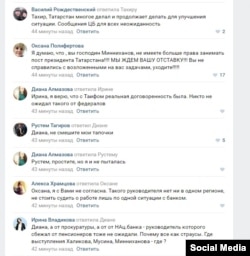 Некоторые открыто призывают к отставке Минниханова: "Я думаю, что вы, господин Минниханов, не имеете больше права занимать пост президента Татарстана. Мы ждем вашу отставку! Вы не справились с возложенными на вас задачами, уходите!". Другие пишут: "Гоните Халикова, сажайте Мусина!"
