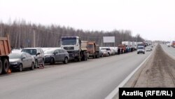 Вдоль трассы на восточной окраине Казани с утра выстроились фуры, тяжелая техника, легковые автомобили.