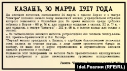 "Первый митинг гражданок г. Казани, с глубоким благоговением вспоминая всех павших за счастье народа, в лице вашем приветствует борцов за свободу, не щадя сил и жизни стремившихся к осуществлению великих идеалов равенства и свободы". - Оглашение этой телеграммы на митинге было приветствовано единодушными клика-одобрения и долго несмолкавшими громкими аплодисментами.