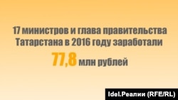 Всего министры заработали 77,8 млн рублей, таким образом в среднем на каждого чиновника из списка приходится по 4,3 млн рублей в год или по 358 тысяч рублей в месяц. Для сравнения общий доходный фонд республики Татарстан, по данным Татарстанстата, составил в 2016 году 1,5 трлн рублей, а средняя зарплата жителя республики в год равна 395 тысячам рублей. Выходит, что в месяц министры зарабатывают приметно столько же, сколько обычные граждане в год.