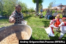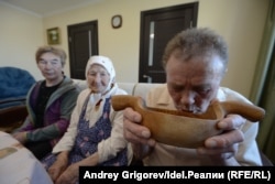 Владислав Эльмень выносит ковш с пивом и поет старинное приветствие. Потом наш провожатый, ученый-филолог и председатель Центрального совета чувашских старейшин Виталий Станъял, расскажет, что в приветствии содержится старинная формула, которую можно перевести следующим образом: если нет медового пива, то найдем хмельной отвар. Медовые сорта пива — симбыл и шербет — считались дорогими из-за того, что целебным был ключевой ингредиент — мед (медовым пивом нас, конечно, тоже угостили).