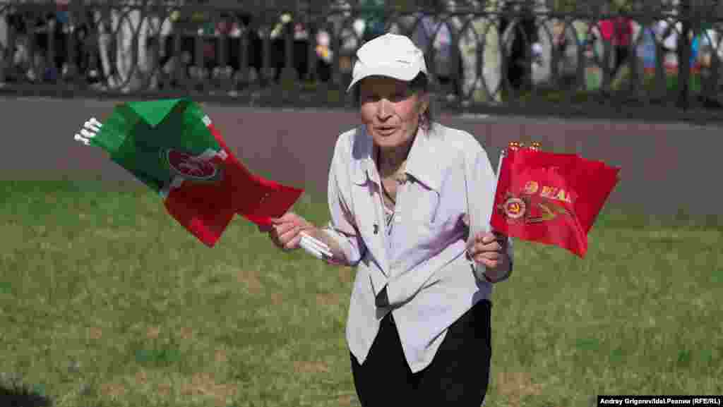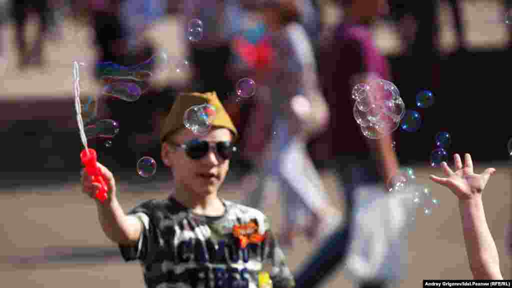 Георгиевские ленты и автомобильные наклейки, которыми уже давно никого не удивишь, оказались потеснены зёлеными пилотками с красными звёздами. Так что теперь георгиевские ленты, вокруг которых поломали столько копий, практически незаметны в пестрой толпе (возможно, потому, что они уже на каждом втором встречном). Тут, правда, тоже заметна некоторая эволюция — некоторые ленты украшены значками и цветочными бутонами — но куда больше бросаются в глаза именно красноармейские пилотки. Торговцы ими расположились у входа в казанский парк Победы. Недорого, 200 рублей — штука. Правда, на взрослые головы головных уборов у продавцов немного. Не то большие размеры уже расхватали, не то основная целевая аудитория — дети.