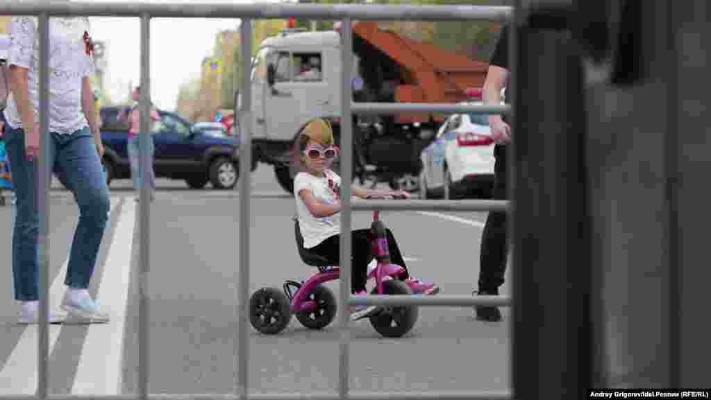 Георгиевские ленты и автомобильные наклейки, которыми уже давно никого не удивишь, оказались потеснены зёлеными пилотками с красными звёздами. Так что теперь георгиевские ленты, вокруг которых поломали столько копий, практически незаметны в пестрой толпе (возможно, потому, что они уже на каждом втором встречном). Тут, правда, тоже заметна некоторая эволюция — некоторые ленты украшены значками и цветочными бутонами — но куда больше бросаются в глаза именно красноармейские пилотки. Торговцы ими расположились у входа в казанский парк Победы. Недорого, 200 рублей — штука. Правда, на взрослые головы головных уборов у продавцов немного. Не то большие размеры уже расхватали, не то основная целевая аудитория — дети.