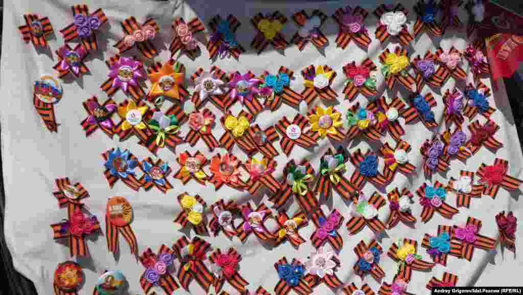 Георгиевские ленты и автомобильные наклейки, которыми уже давно никого не удивишь, оказались потеснены зёлеными пилотками с красными звёздами. Так что теперь георгиевские ленты, вокруг которых поломали столько копий, практически незаметны в пестрой толпе (возможно, потому, что они уже на каждом втором встречном). Тут, правда, тоже заметна некоторая эволюция — некоторые ленты украшены значками и цветочными бутонами — но куда больше бросаются в глаза именно красноармейские пилотки. Торговцы ими расположились у входа в казанский парк Победы. Недорого, 200 рублей — штука. Правда, на взрослые головы головных уборов у продавцов немного. Не то большие размеры уже расхватали, не то основная целевая аудитория — дети.