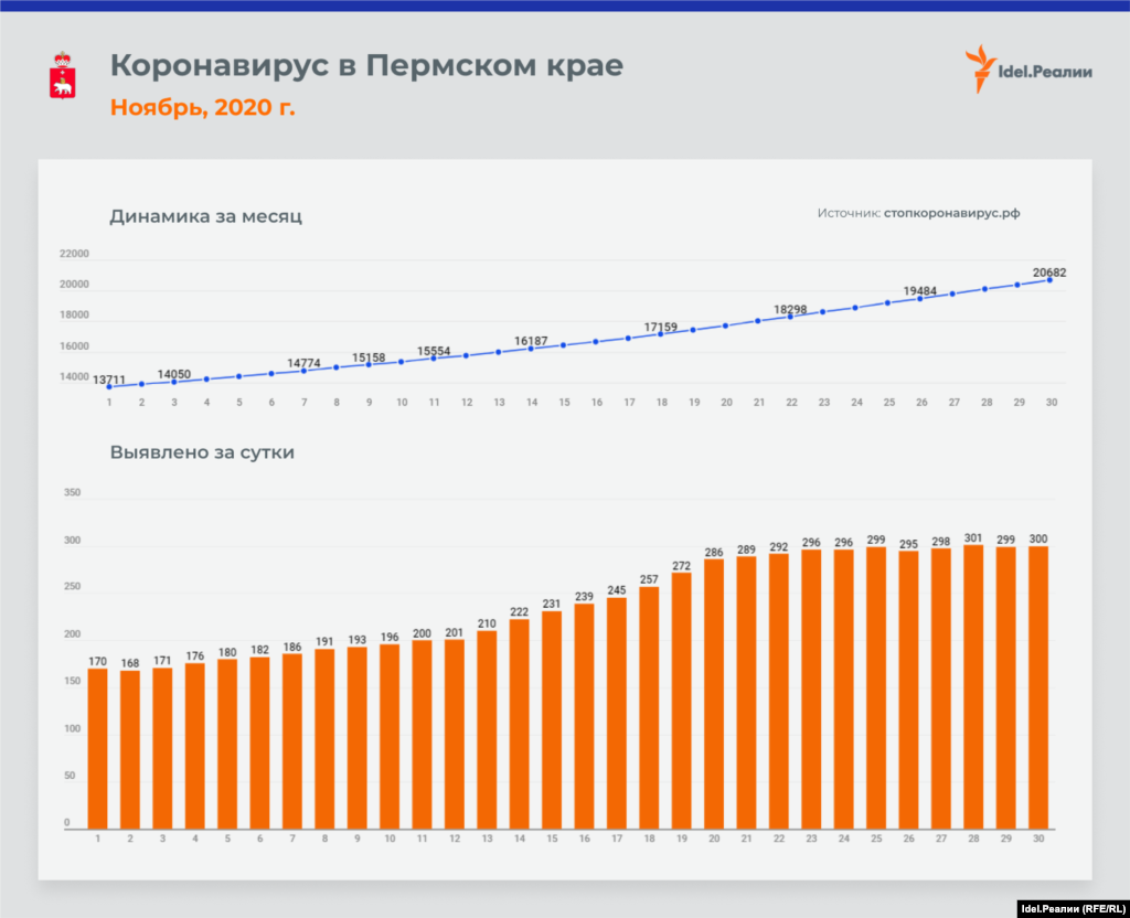 Если в начале месяца в Татарстане ежедневно выявлялось 45 случаев заражения коронавирусной инфекцией, то к концу ноября эта цифра почти удвоилась — до 84-х. В процентном соотношении это наибольший рост среди всех регионов Приволжского федерального округа — наряду с Чувашией и Пермским краем. А вот в Оренбургской и Пензенской областях на протяжении всего месяца цифры практически идентичные: ежедневно выявлялось чуть ли не одинакое количество случаев инфицирования.