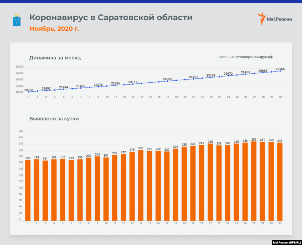 Если в начале месяца в Татарстане ежедневно выявлялось 45 случаев заражения коронавирусной инфекцией, то к концу ноября эта цифра почти удвоилась — до 84-х. В процентном соотношении это наибольший рост среди всех регионов Приволжского федерального округа — наряду с Чувашией и Пермским краем. А вот в Оренбургской и Пензенской областях на протяжении всего месяца цифры практически идентичные: ежедневно выявлялось чуть ли не одинакое количество случаев инфицирования.