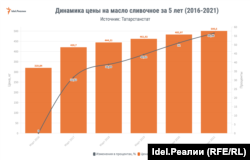Согласно официальным данным Татарстанстата (это орган статистики, такой есть в каждом регионе России), самый большой скачок в цене пришелся на сливочное масло, которое подорожало сразу 56,5% за последние пять лет — с марта 2016 года. Тогда килограмм можно было купить за 319,84 рубля, а сейчас — за 500,5 рубля.