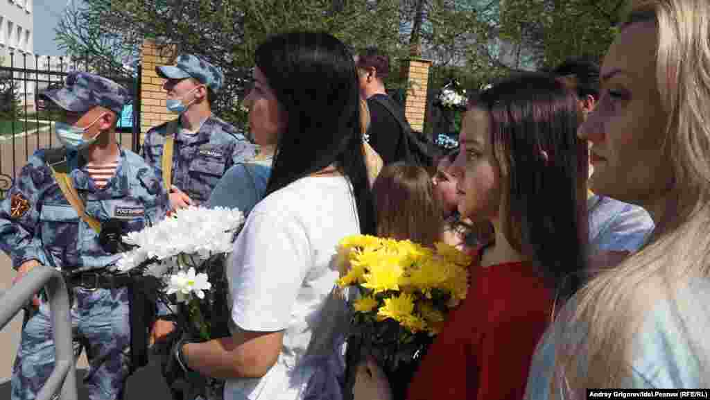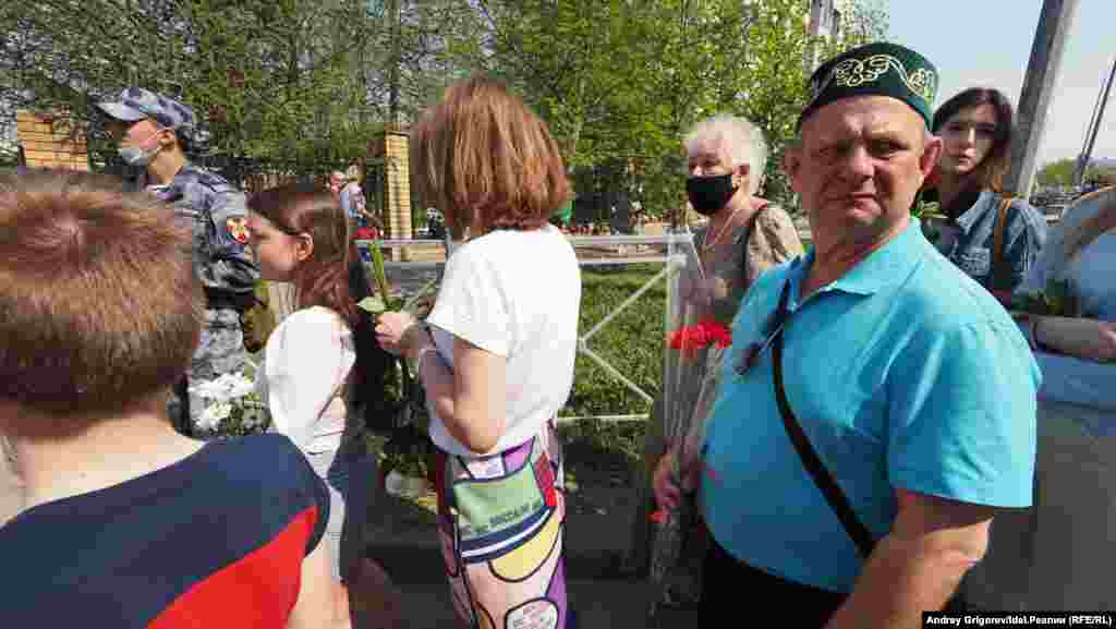 Вместе с тем у забора школы со стороны улицы Файзи образовался еще один мемориал. Вот только к нему полиция пропускала людей маленькими группками — в результате чего на улице выросла очередь протяженностью более ста метров. В отличие от стихийного мемориала, доступ к которому не контролировал никто, люди внутри не задерживались: положив цветы и игрушки у забора, описывали круг и выходили через другой импровизированный "КПП".