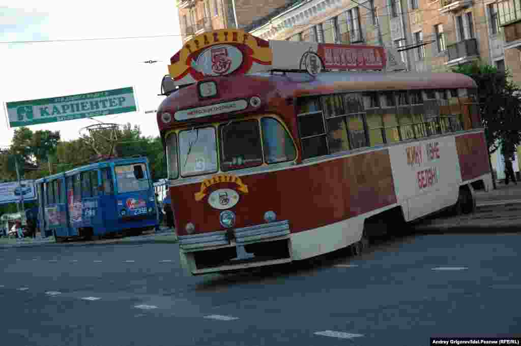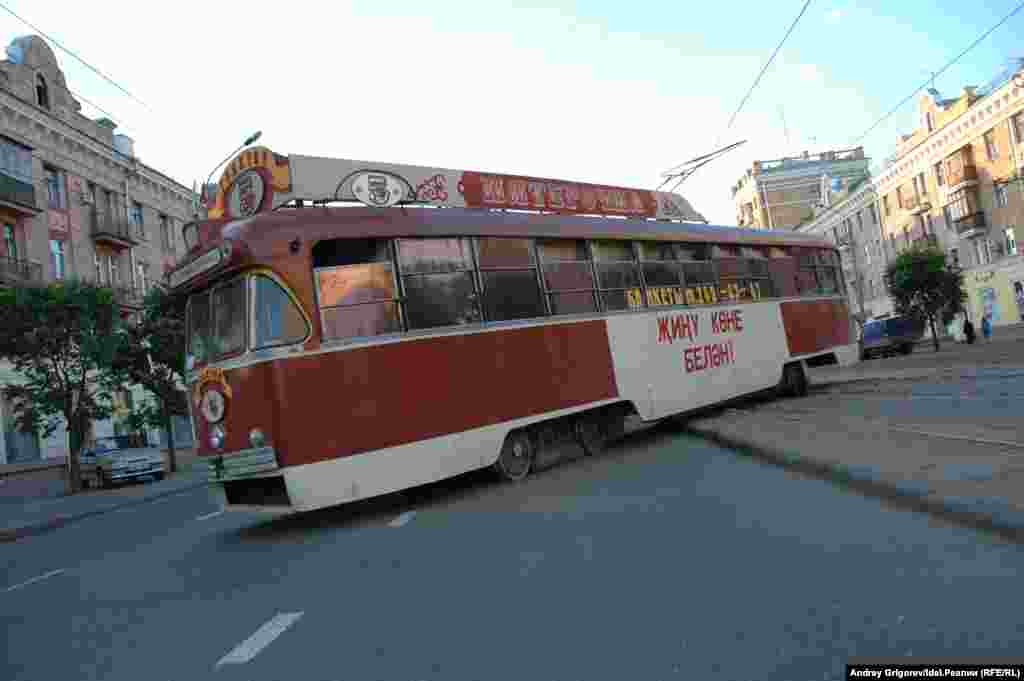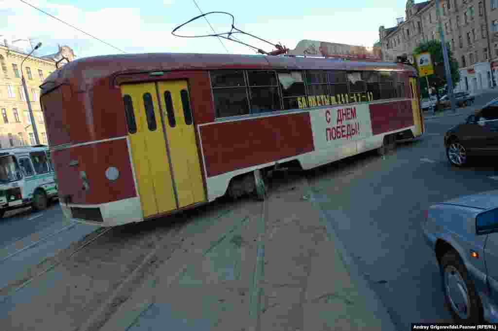 Tatarstan -- Kazan -- streetcar with restaraunt went off the rails -- 13Jun2007