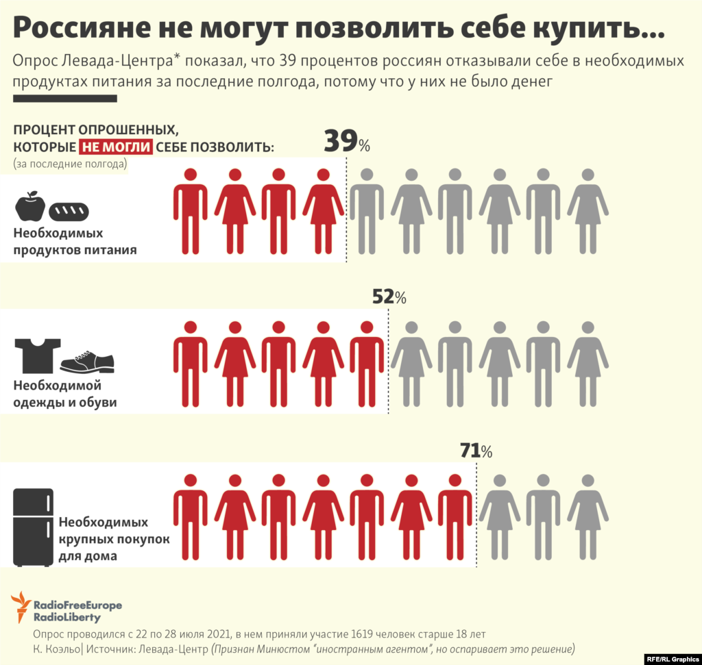 Опрос Левада-Центра показал, что 39% россиян отказывали себе в необходимых продуктах питания за последние полгода, потому что у них не было денег