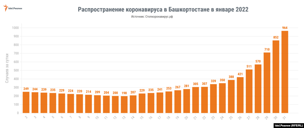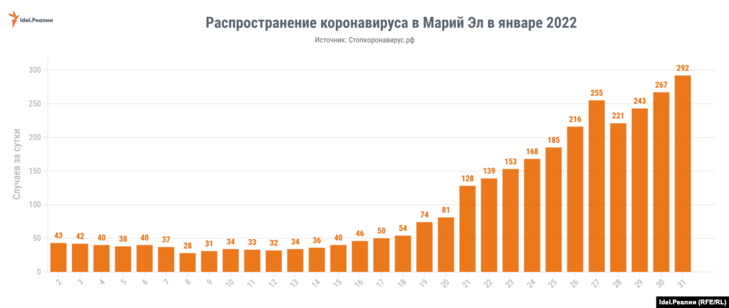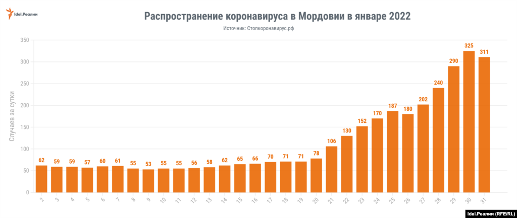 Самый большой рост суточных заражений за месяц показала Удмуртия. Если в начале января было 52 случая за сутки, в конце января — уже 1351. Рост в 26 раз. Следом идут Чувашия (рост в 13,2 раза) и Оренбургская область (в 10,2 раза).