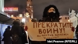 За несколько минут до семи участников антивоенной акции опередил представитель НОД, развернувший плакат "Приветствуем решение лидера в освобождении от окупантов" (орфография сохранена). В семь он ретировался, и корреспондент "Idel.Реалии" не заметил, чтобы кто-то из многочисленных полицейских поинтересовался его документами.