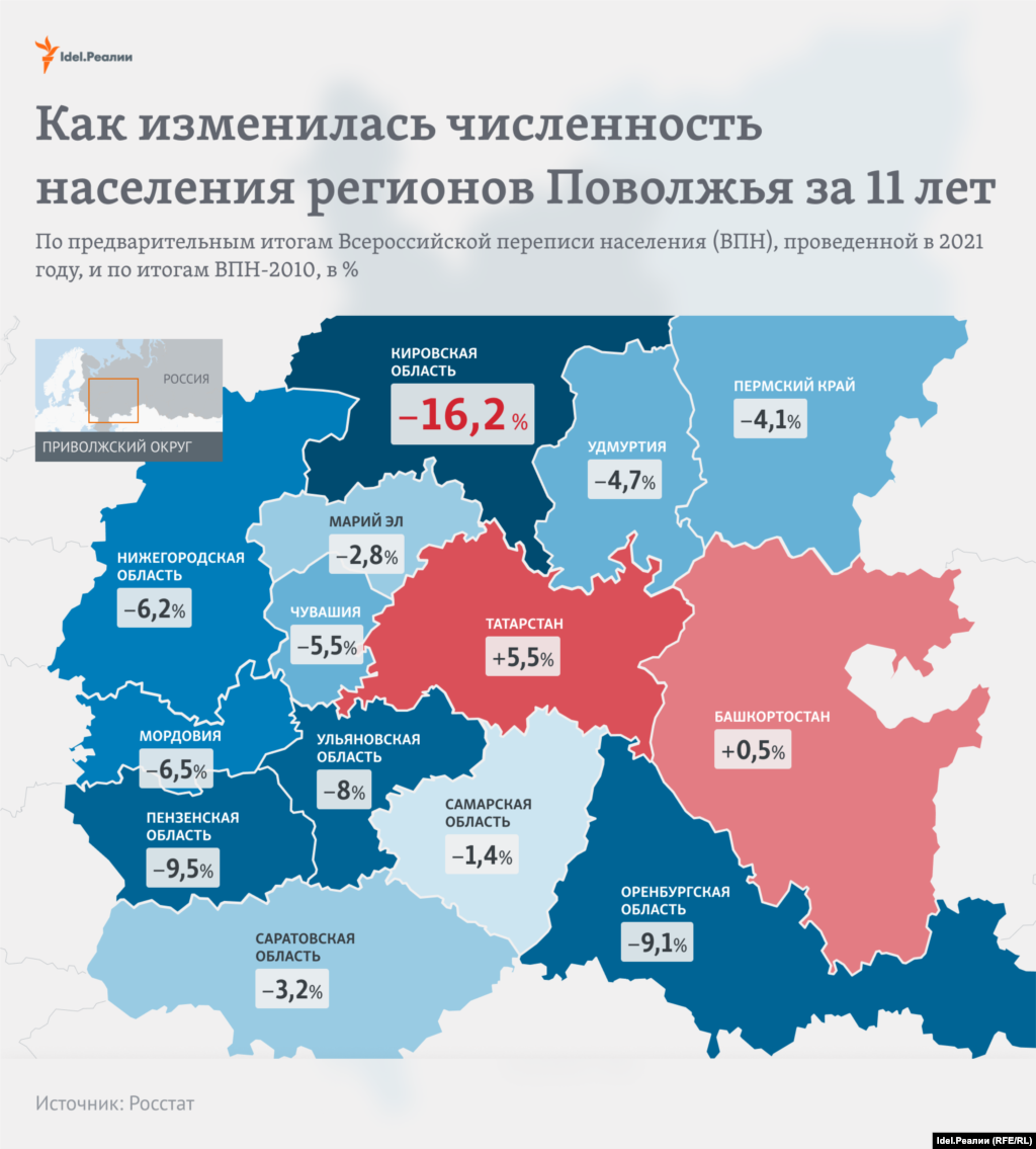 Только в двух регионах Поволжья отметился прирост населения за 11 лет — это Башкортостан (+19 тысяч) и Татарстан (+210 тысяч).