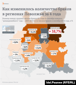 Так, в Пермском крае количество браков в сентябре 2022 года выросло на 38,7%. По этому показателю регион на первом месте. На втором месте — Кировская область с ростом в 31,2%, на третьем месте — Марий Эл с ростом в 26%.