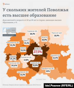 В рейтинге наиболее "образованных" регионов оказались Мордовия, Самарская область и Татарстан, где более 25% жителей от 20 лет окончили вузы. На первом месте Татарстан с показателем 27,5%.