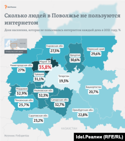 Меньше всего активных пользователей интернета фиксируется в Марий Эл — более 35% населения им не пользуется. На втором месте по этому показателю — Мордовия с 32,9% населения. На третьем месте — Самарская область.