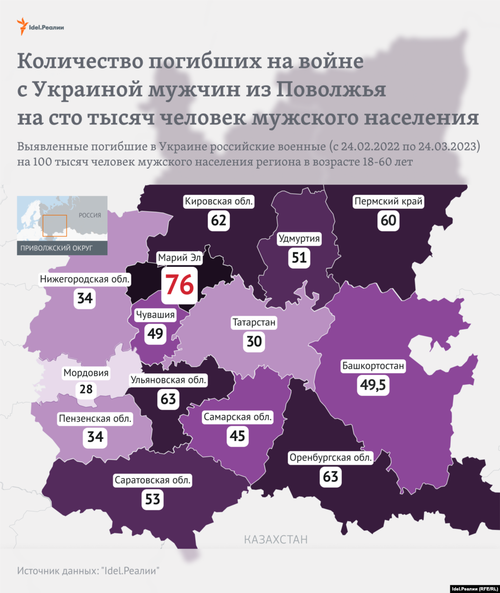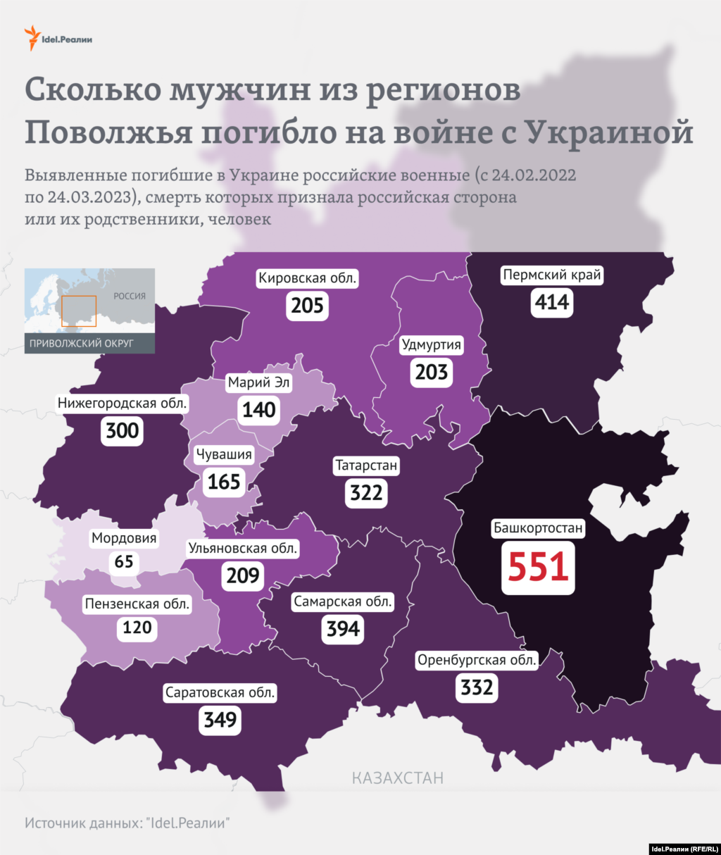 По подсчетам "Idel.Реалии" на 24 марта 2023 года, Башкортостан по числу погибших снова на первом месте — 551 человек, Следом идут Пермский край (414) и Самарская область (394).