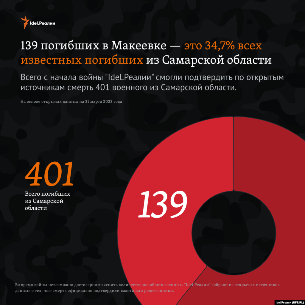 На момент публикации этого материала достоверно известно о 4 125 погибших из республик и областей ПФО. 401 из них — выходцы из Самарской области. При этом 139 человек погибли именно в Макеевке.