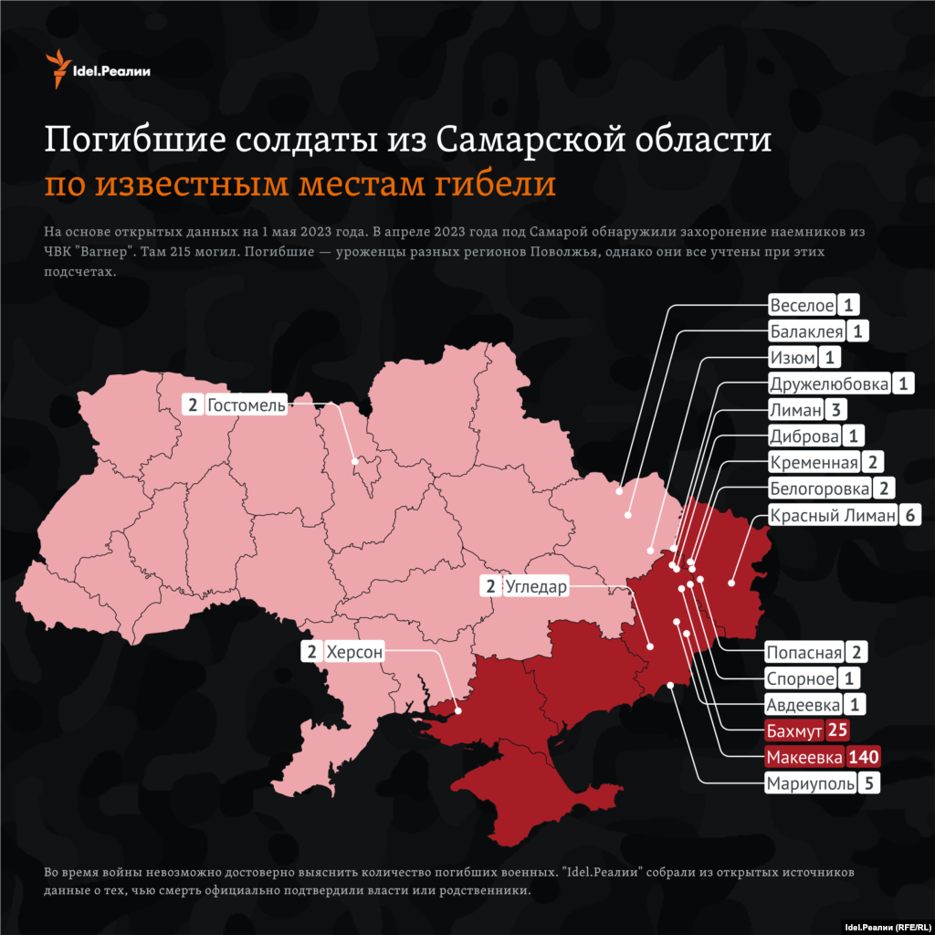 В апреле 2023 года под Самарой обнаружили захоронение наемников из ЧВК "Вагнер". Там 215 могил. Погибшие — уроженцы разных регионов Поволжья, однако они все учтены при этих подсчетах.