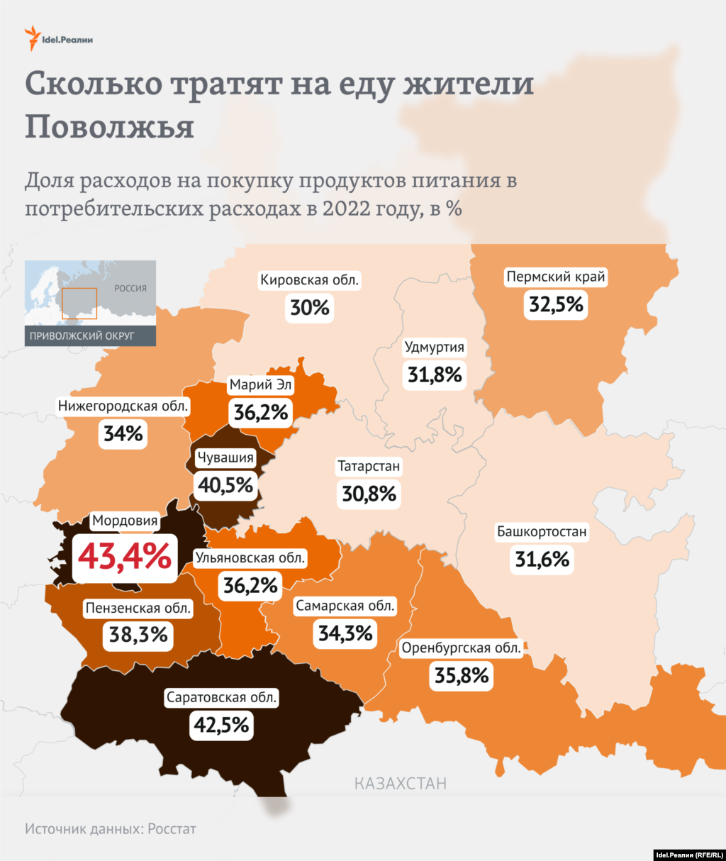 На еду в прошлом году пришлось более 43% расходов среднего жителя Мордовии. По этому показателю республика заняла первое место. Следом за ней идут Саратовская область (42,5% расходов) и Чувашия (40,5%).