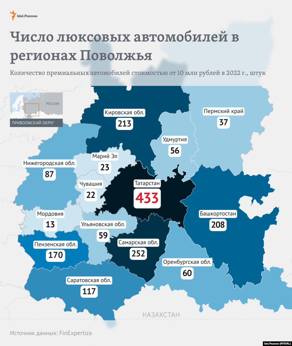 Меньше всего люксовых авто в Мордовии (13), Чувашии (22) и Марий Эл (23).