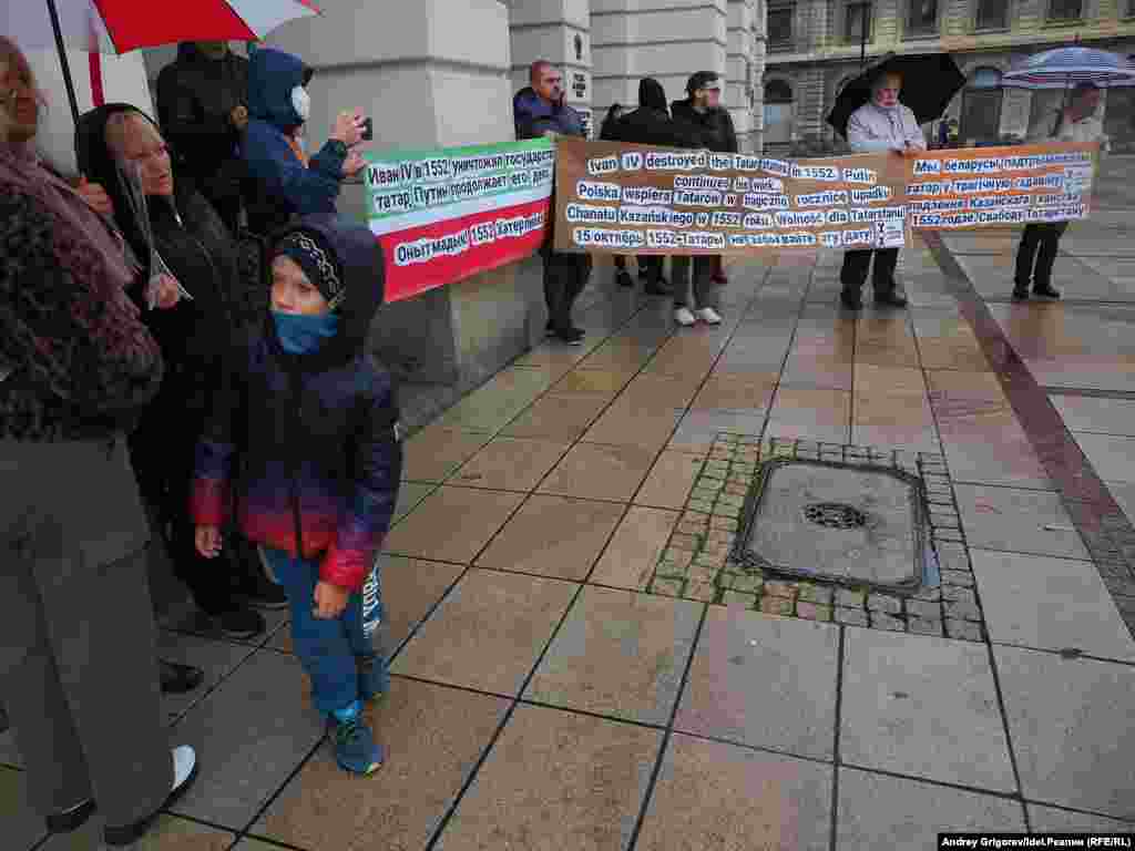 Всего, несмотря на проливной дождь, собралось более тридцати человек, которым Нафис Кашапов раздал плакаты собственного изготовления. Надписи на плакатах были сделаны на разных языках — русском, татарском, украинском, белорусском, польском, английском.