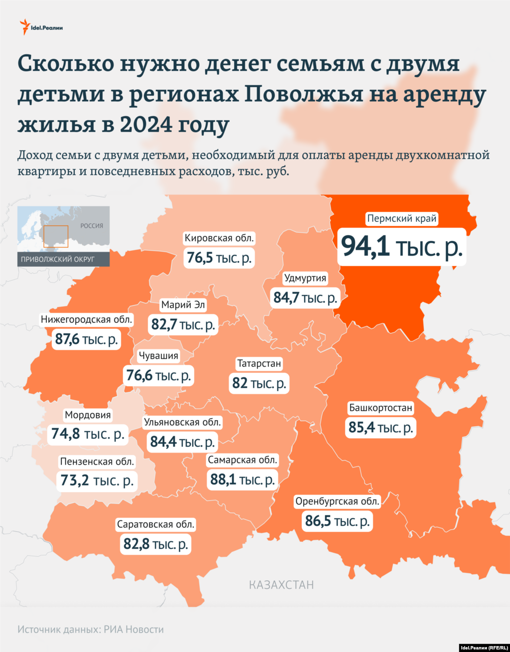 Рейтинг российских регионов по доступности аренды жилья подготовило РИА Новости на основе данных Росстата. Предполагается, что в семье двое взрослых и двое детей. 70% средств, оставшихся после вычета из семейного бюджета прожиточных минимумов, семья тратит на аренду жилья, 30% — на прочие расходы.