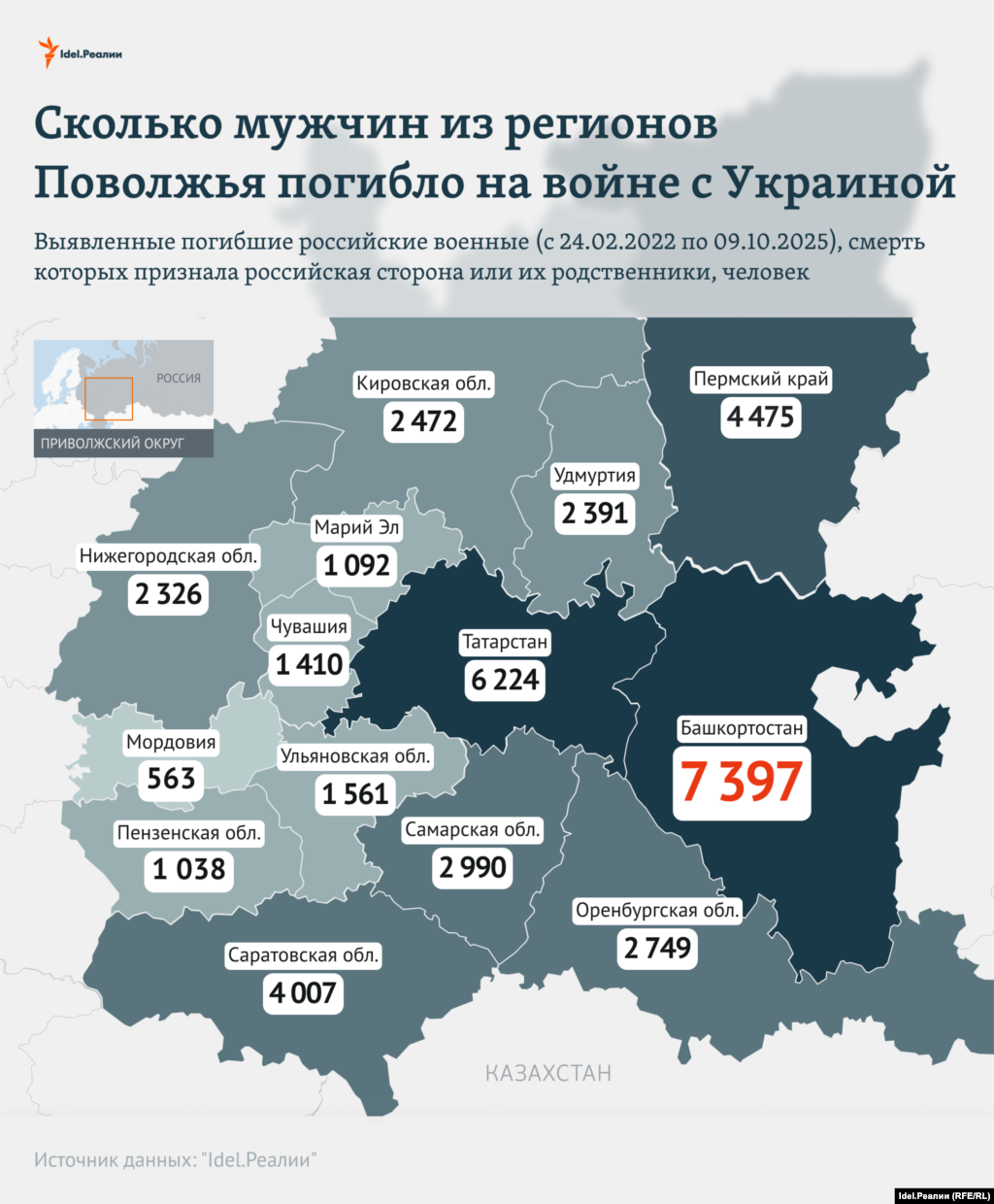 В абсолютных цифрах — не только в Поволжье, но и в целом по России — лидируют Башкортостан и Татарстан. В Башкортостане с начала полномасштабного российского вторжения в Украину погибли как минимум 7 397 человек, в Татарстане — 6 224. В Кировской же области в абсолютных цифрах погибли 2 472 человека.