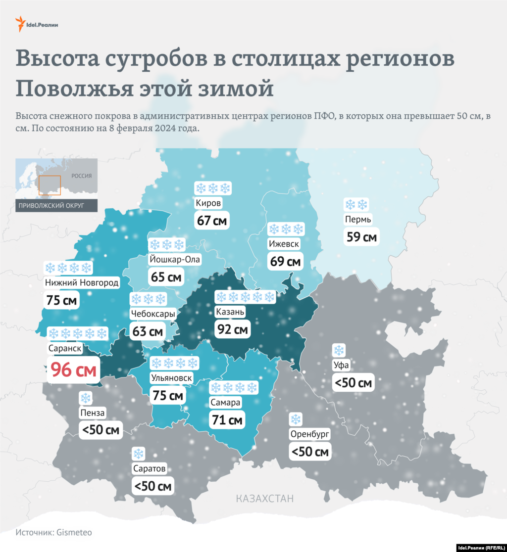 По данным на 8 февраля, в Саранске высота снежного прокрова достигла 96 см, что поставило столицу Мордовии на первое место по этому показателю. На втором месте — Татарстан (92 см), на третьем — Нижний Новгород (75 см) и Ульяновск (75 см).