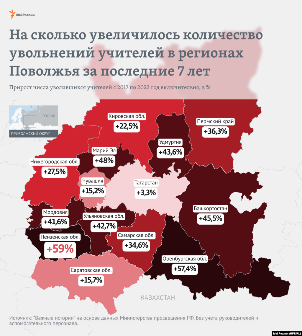 В двух регионах Поволжья число уволившихся учителей выросло более чем на 50% — в Оренбургской и Пензенский областях. Также в лидерах по темпам увольнения учителей (в порядке убывания) — Марий Эл (+48%), Башкортостан (+45,5%), Удмуртия (+43,6%), Ульяновская область (+42,7%) и Мордовия (+41,6%).